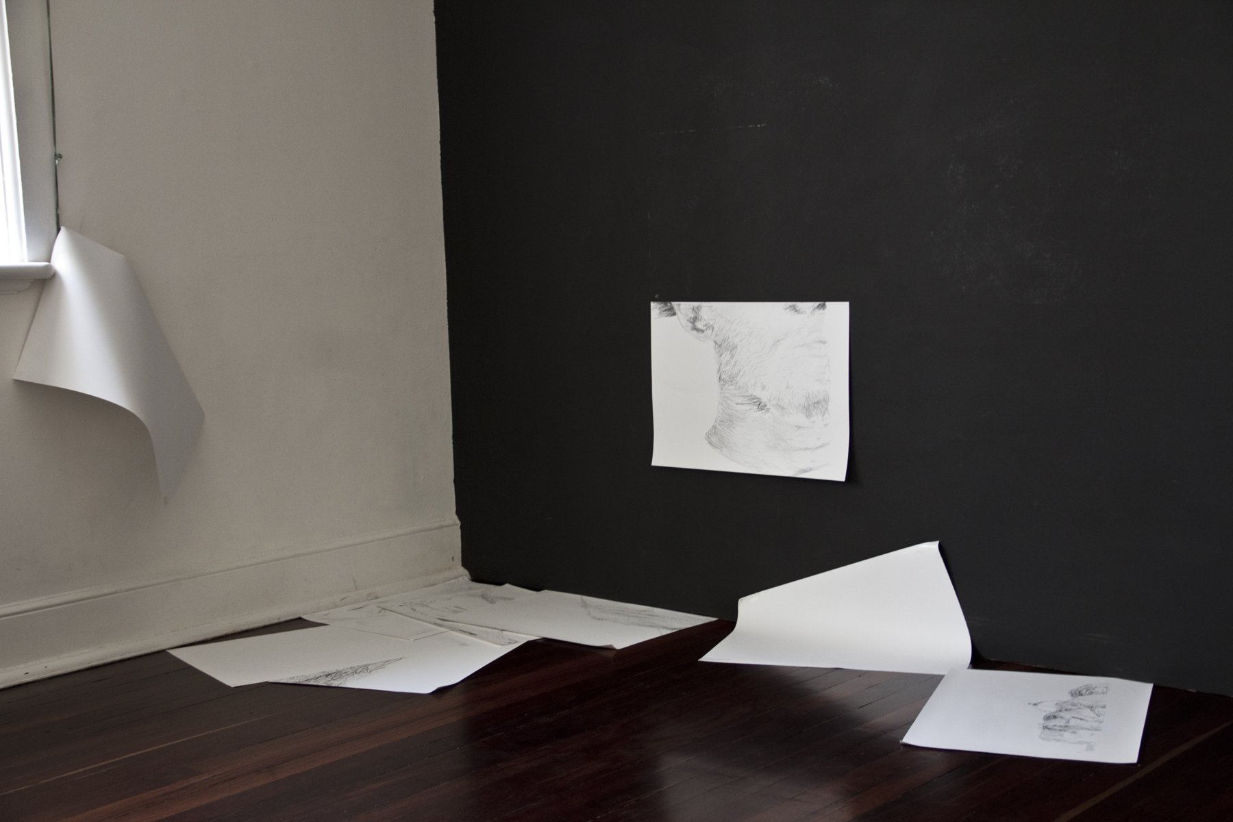Due to the humidity and temperatures my drawings have been falling off the walls over night. I am either going to have to find a better way to anchor them to the walls, clear them away and store them, or leave them where they lie, building up over the period of the residency. Ideally I would like the work to build up on the walls, but only two of the four walls will take pins, which might make that difficult.