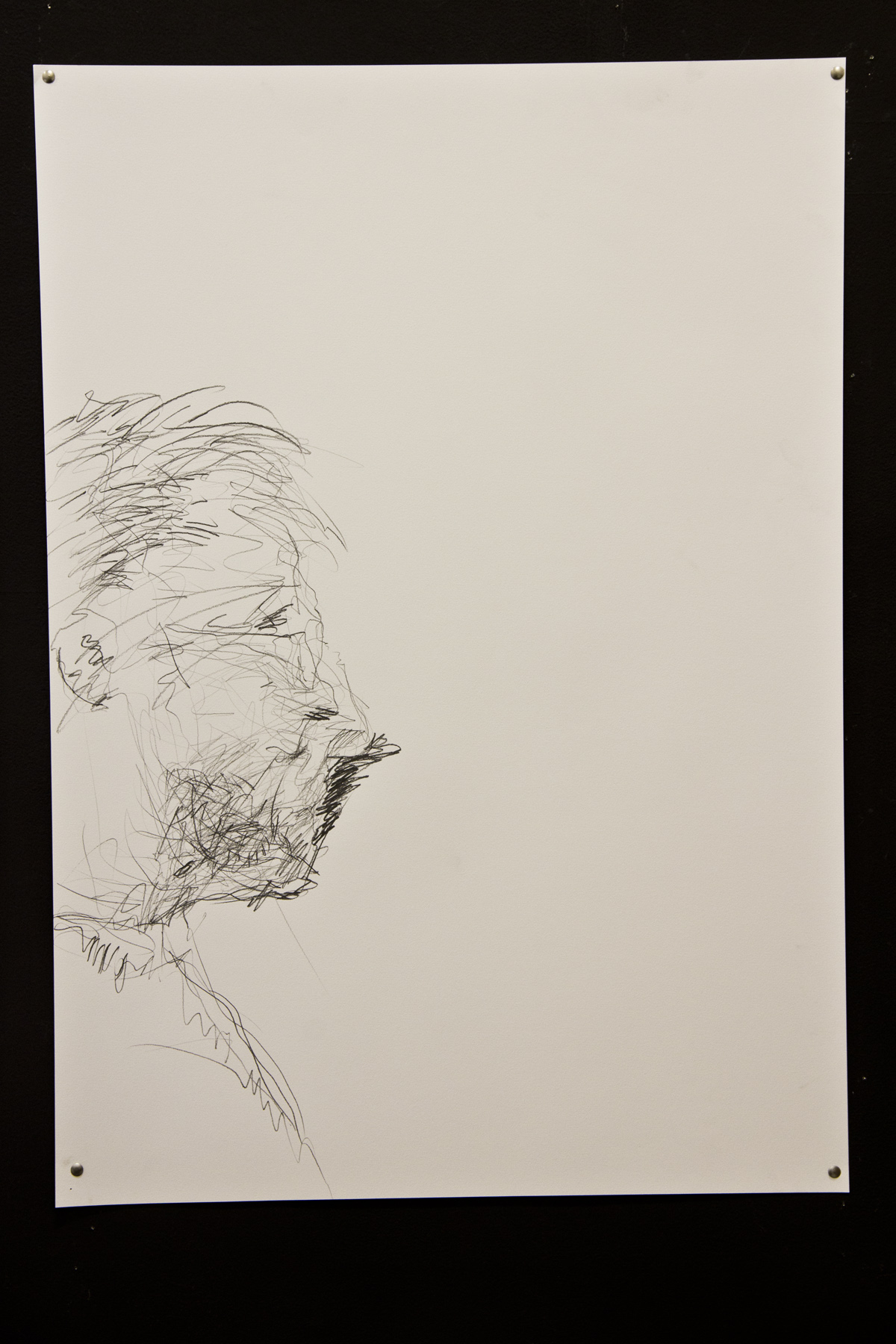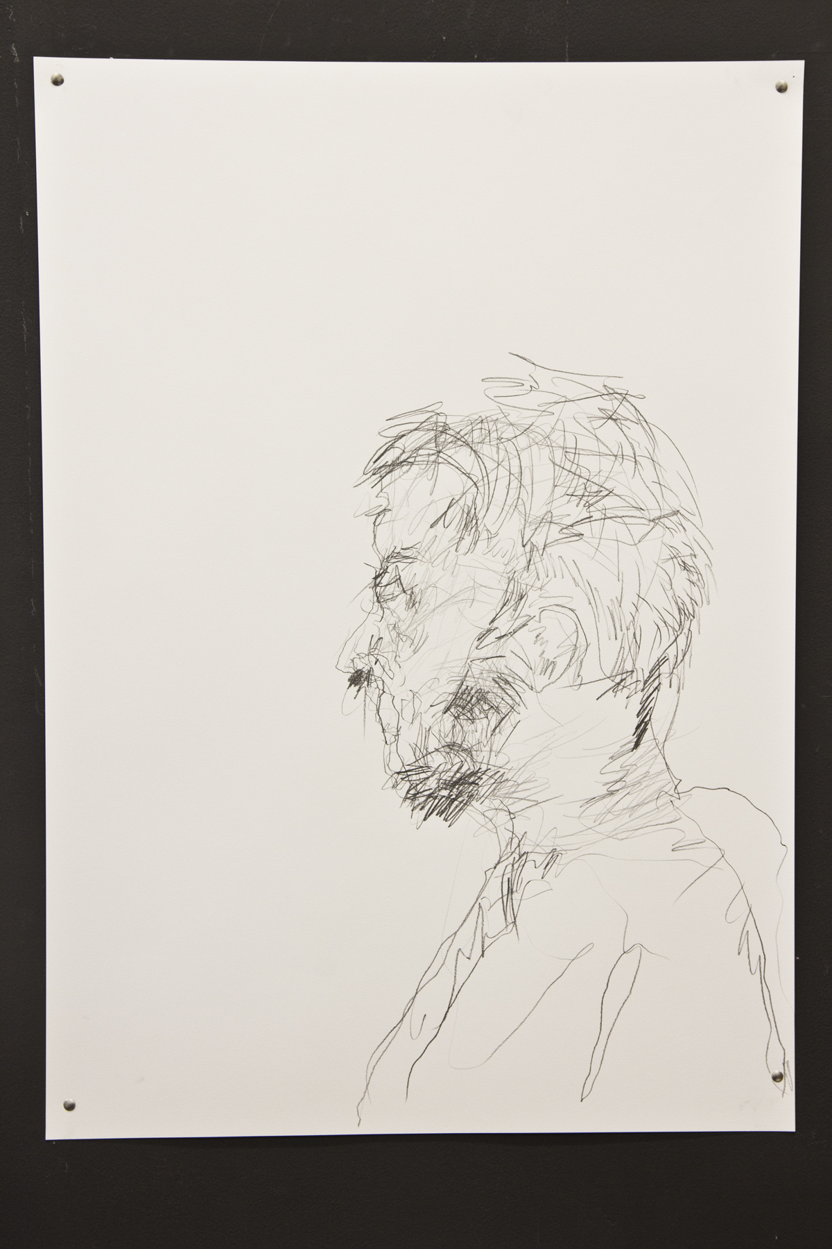 Line, while an incredibly simple tool, has an incredibly rich and broad visual language. Marks can be used to describe silhouette, contour, surface, light and shade. A single line from a 2B pencil may describe the silhouette of a nose and lip, the shade above the chin, the contour of a cheek and end as the heavy and gestural description of a hair. Such lines can often form complex and seemingly chaotic passages, intersecting and changing over the surface of the paper, while still ultimately forming a coherent representation of the subject.