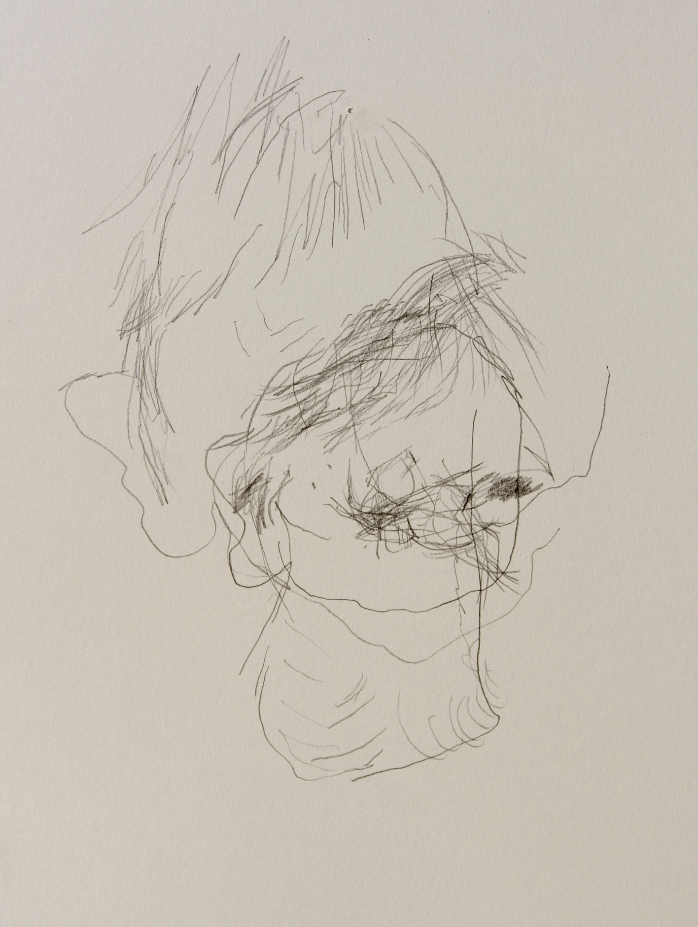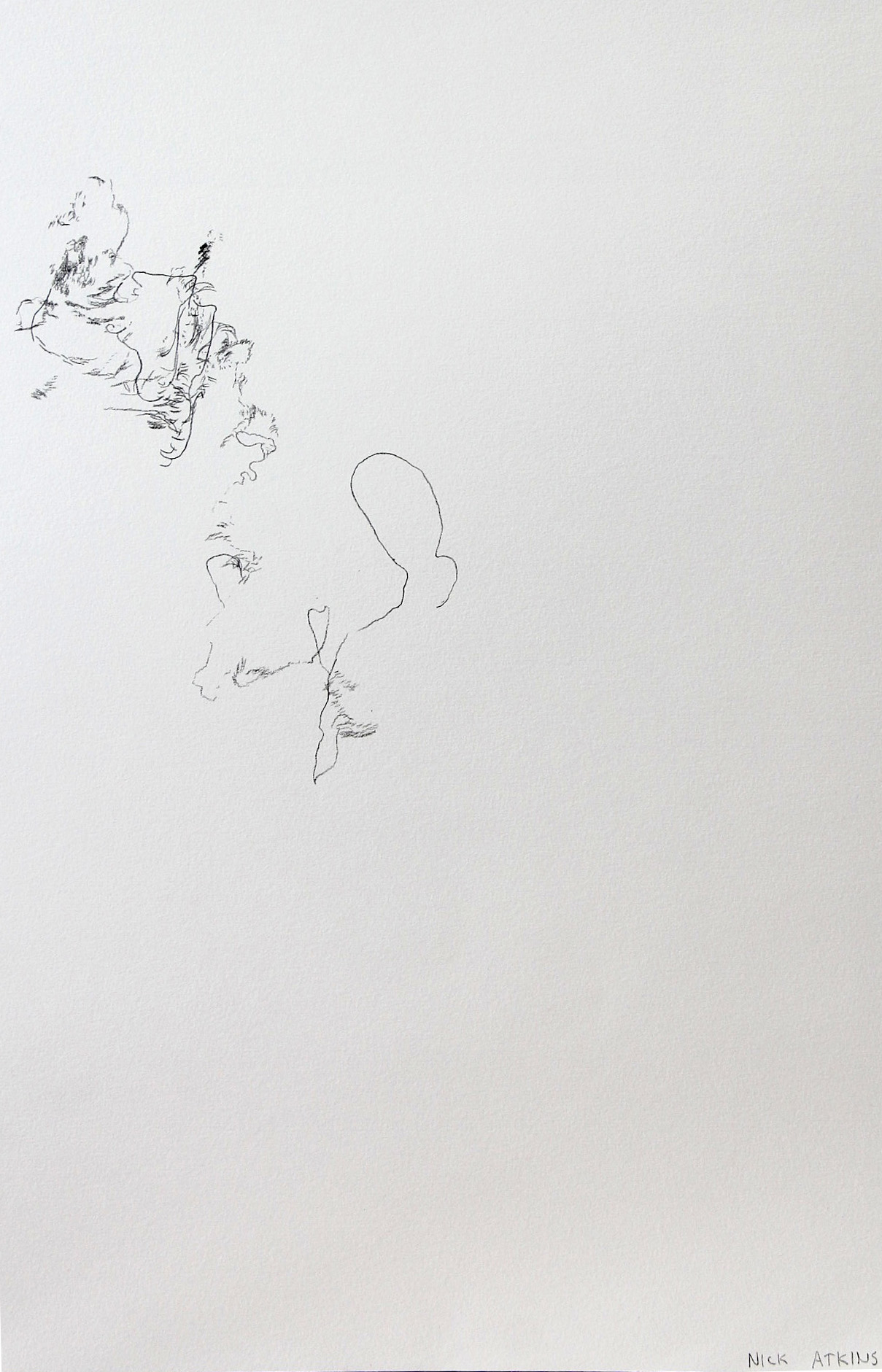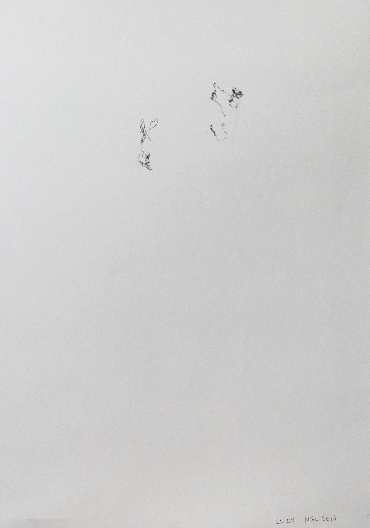 By drawing upside down I am playing with interrupting the conventional ergonomics of drawing, an element that is so familiar to drawing that it recedes into the background and is rarely considered as an active element of process. In these drawings I hope to bring environmental factors like gravity, the body interrupting itself, and the relative position of the drawing surface back to the foreground, so that they become active elements that contribute to the activity of drawing. As I engage with and become familiar with these processes and assess the influence they have on the emergent drawings I begin to accomodate or acclimatise to their influence. This circular and recursive quality makes it difficult to assess such elements in their fresh uninterrupted and unassisted state— as the process of their discovery reveals the properties that may prove interesting to assess as accessed through limited perceptual experience— any artificial limitations of perception (such as blindfolds) are immediately negated as soon as the manifest drawing is assessed. Furthermore, the familiarity with how intentional actions create image-lines will forever influence how intentional lines are made in the future.
