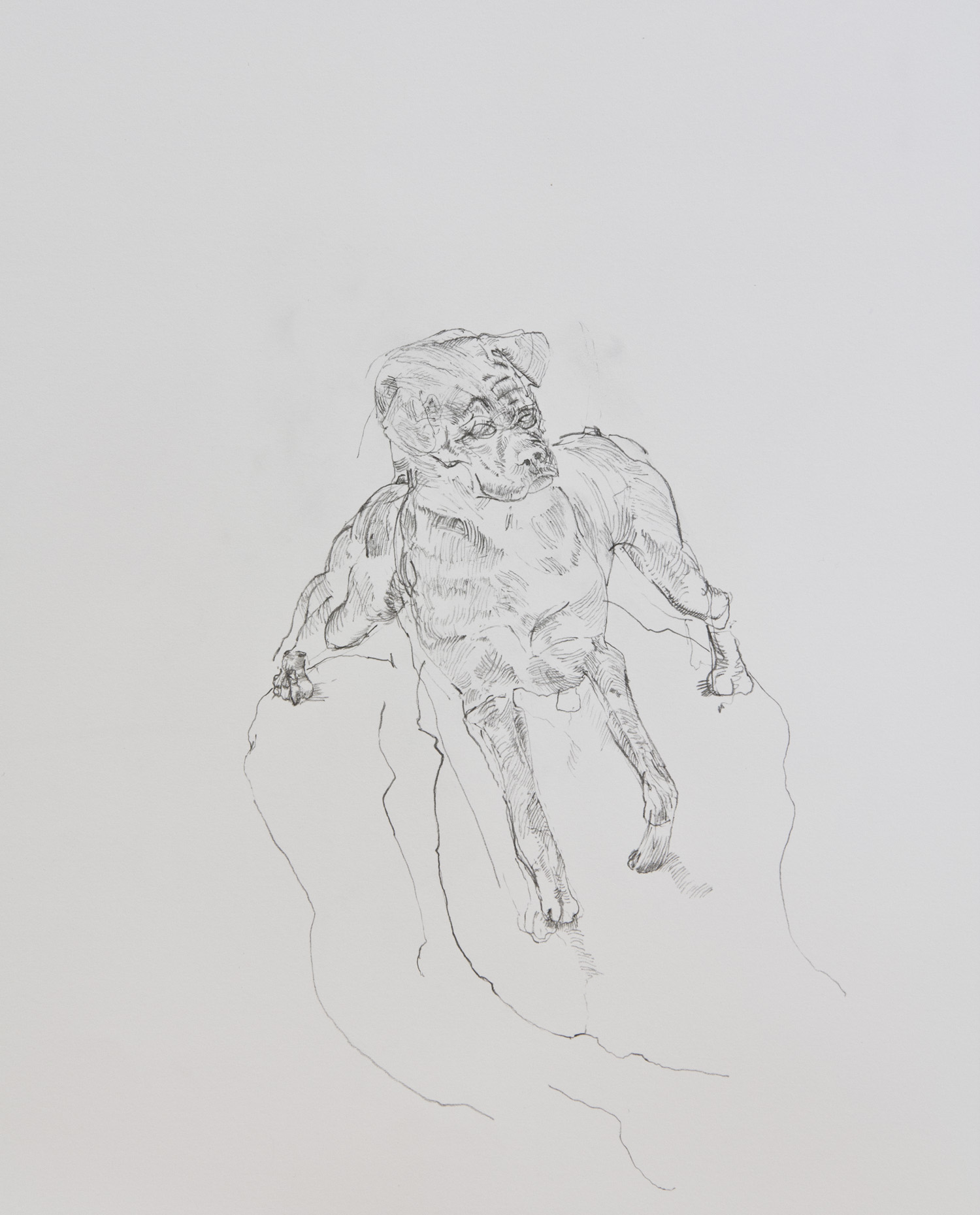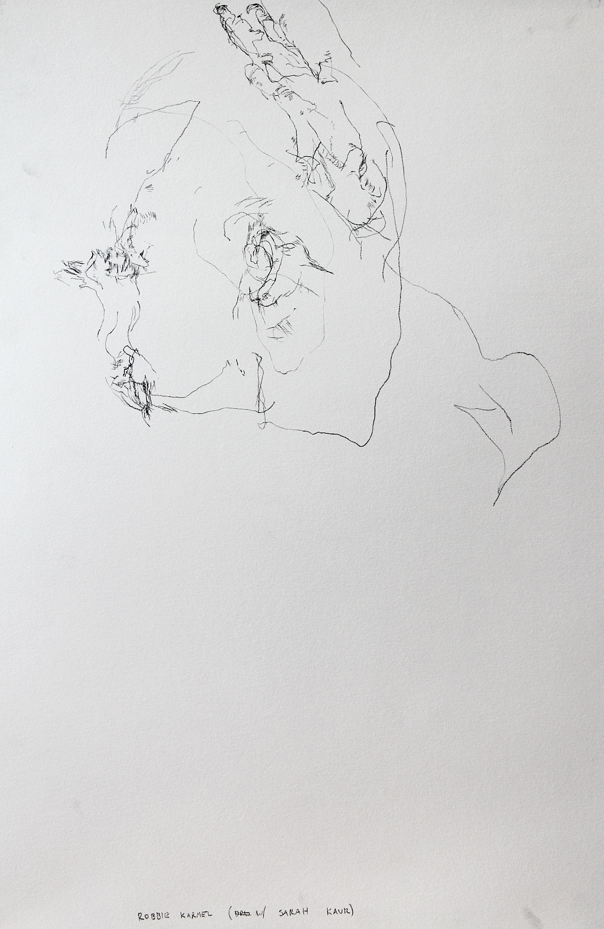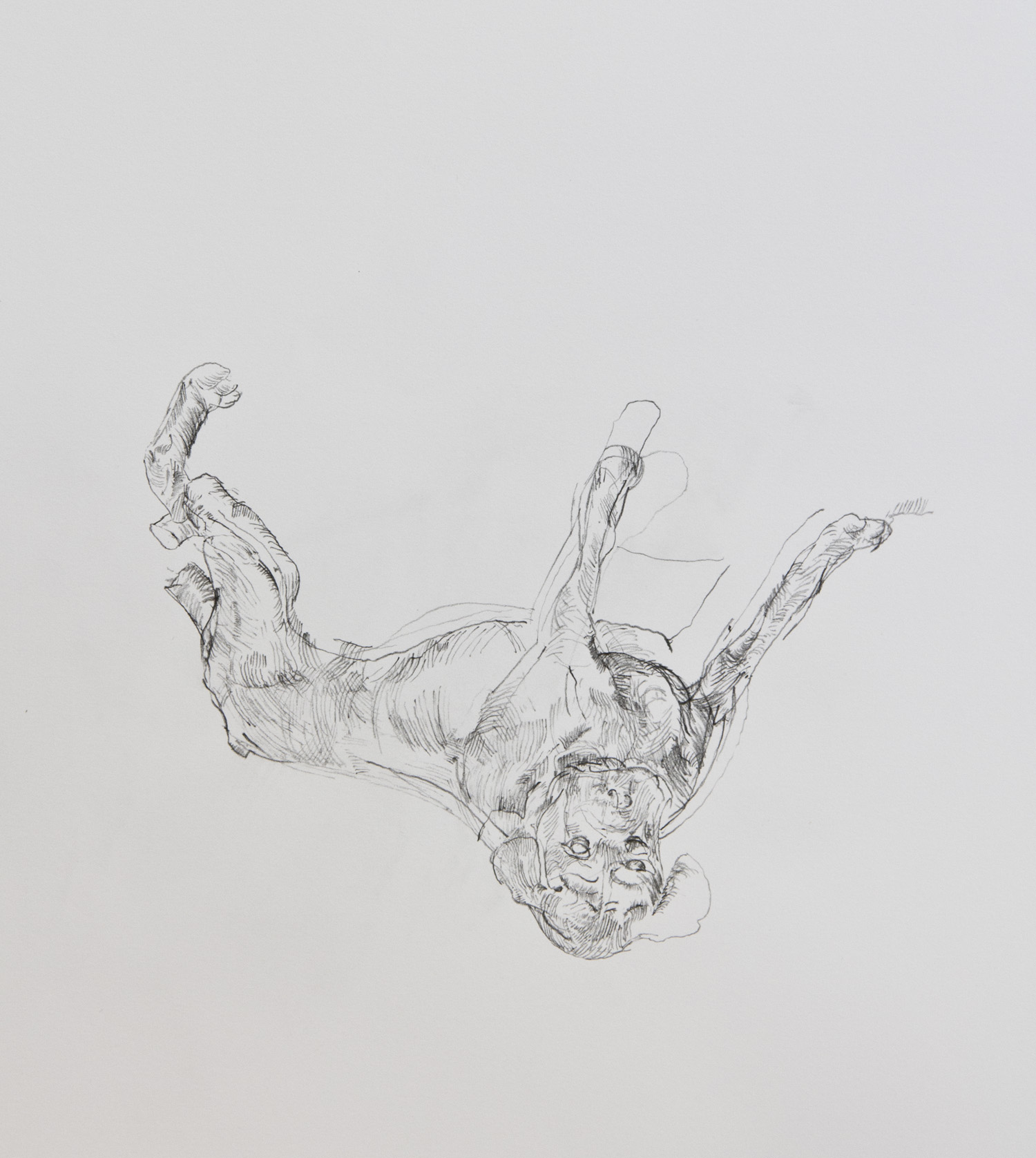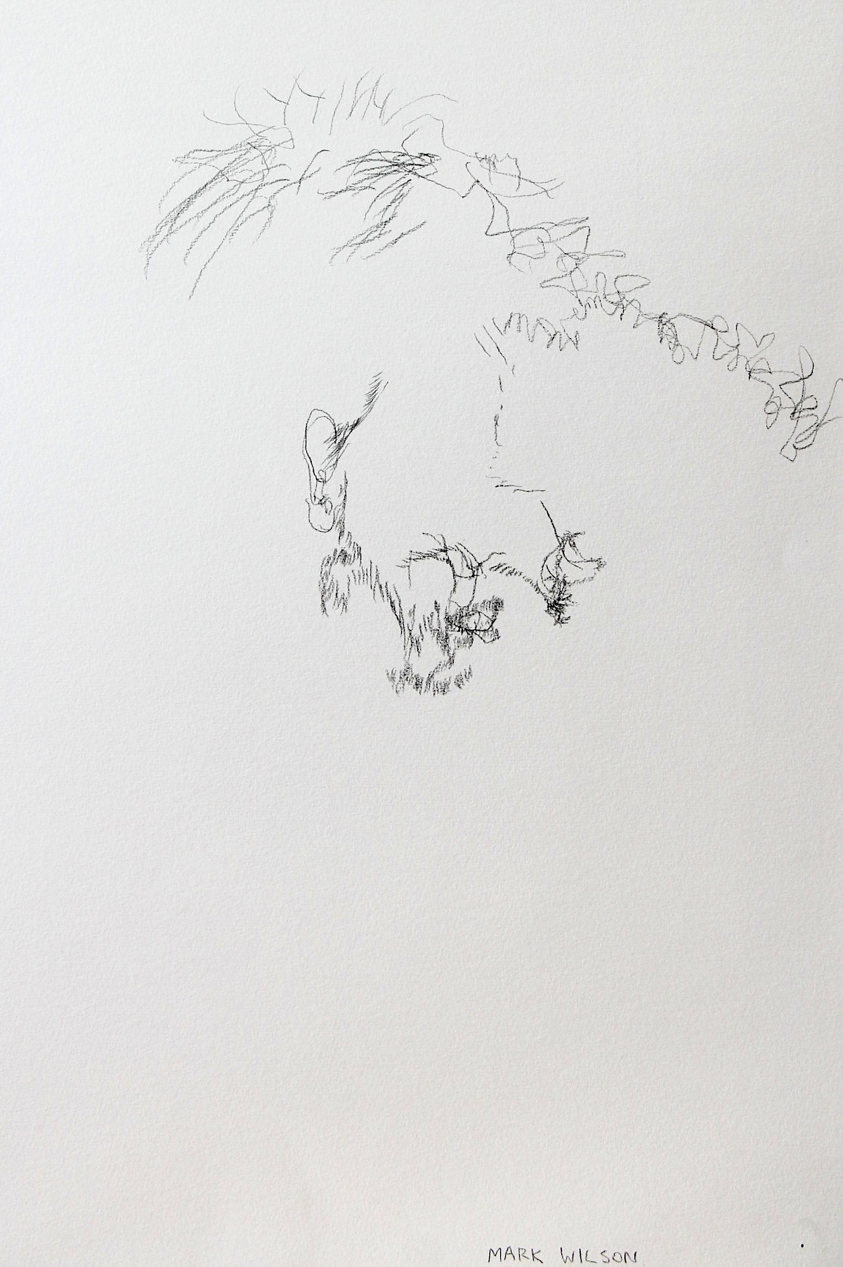 By drawing upside down I am playing with interrupting the conventional ergonomics of drawing, an element that is so familiar to drawing that it recedes into the background and is rarely considered as an active element of process. In these drawings I hope to bring environmental factors like gravity, the body interrupting itself, and the relative position of the drawing surface back to the foreground, so that they become active elements that contribute to the activity of drawing. As I engage with and become familiar with these processes and assess the influence they have on the emergent drawings I begin to accomodate or acclimatise to their influence. This circular and recursive quality makes it difficult to assess such elements in their fresh uninterrupted and unassisted state— as the process of their discovery reveals the properties that may prove interesting to assess as accessed through limited perceptual experience— any artificial limitations of perception (such as blindfolds) are immediately negated as soon as the manifest drawing is assessed. Furthermore, the familiarity with how intentional actions create image-lines will forever influence how intentional lines are made in the future.
