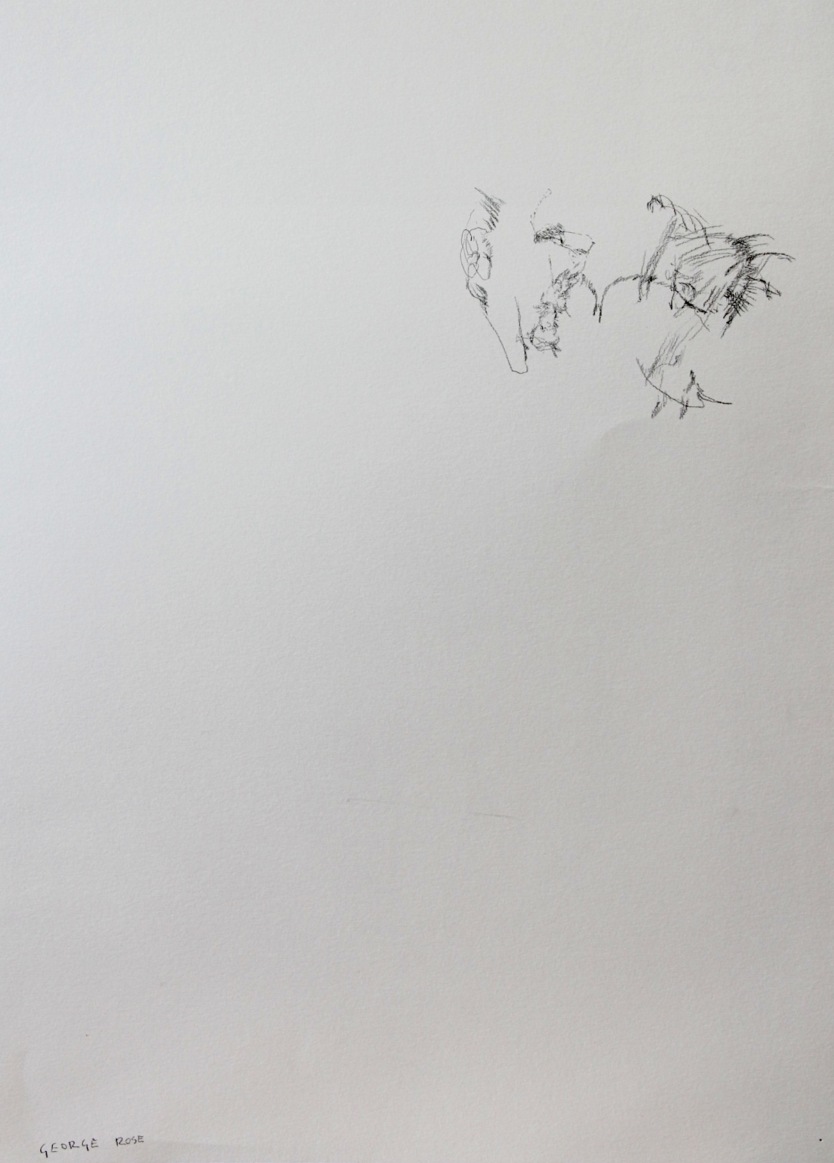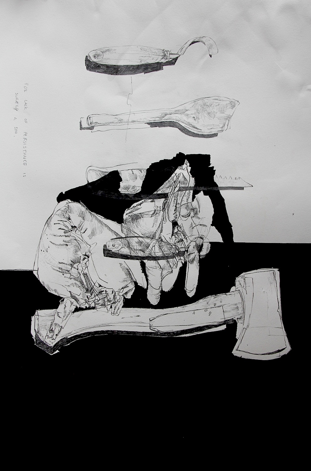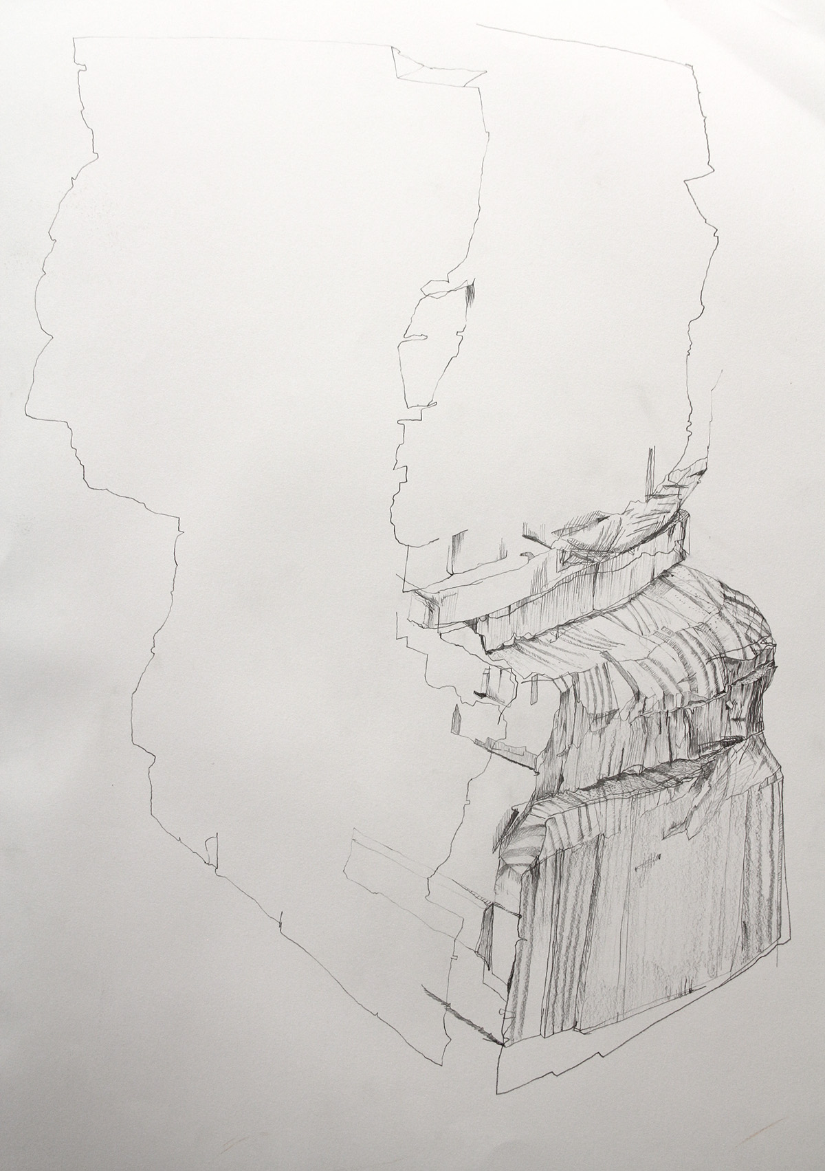 These drawing below are a smaller scale, each drawing is on an A2 sheet of paper. I have been experimenting with proprioceptive drawing from external viewpoints, imagined or simulated body positions, and projecting myself into positional relationships with objects. The first two drawings are done while sitting at my desk with the drawing pad in my lap, a position I spend a lot of time in, I find that if I don’t make a conscious effort to select an external viewpoint I project my body onto the paper through a trajectory in line with my head, however there seems to be no ‘front’ or ‘back’ to the manifest representation, in being flattened it takes a form that can be read as concave or convex.