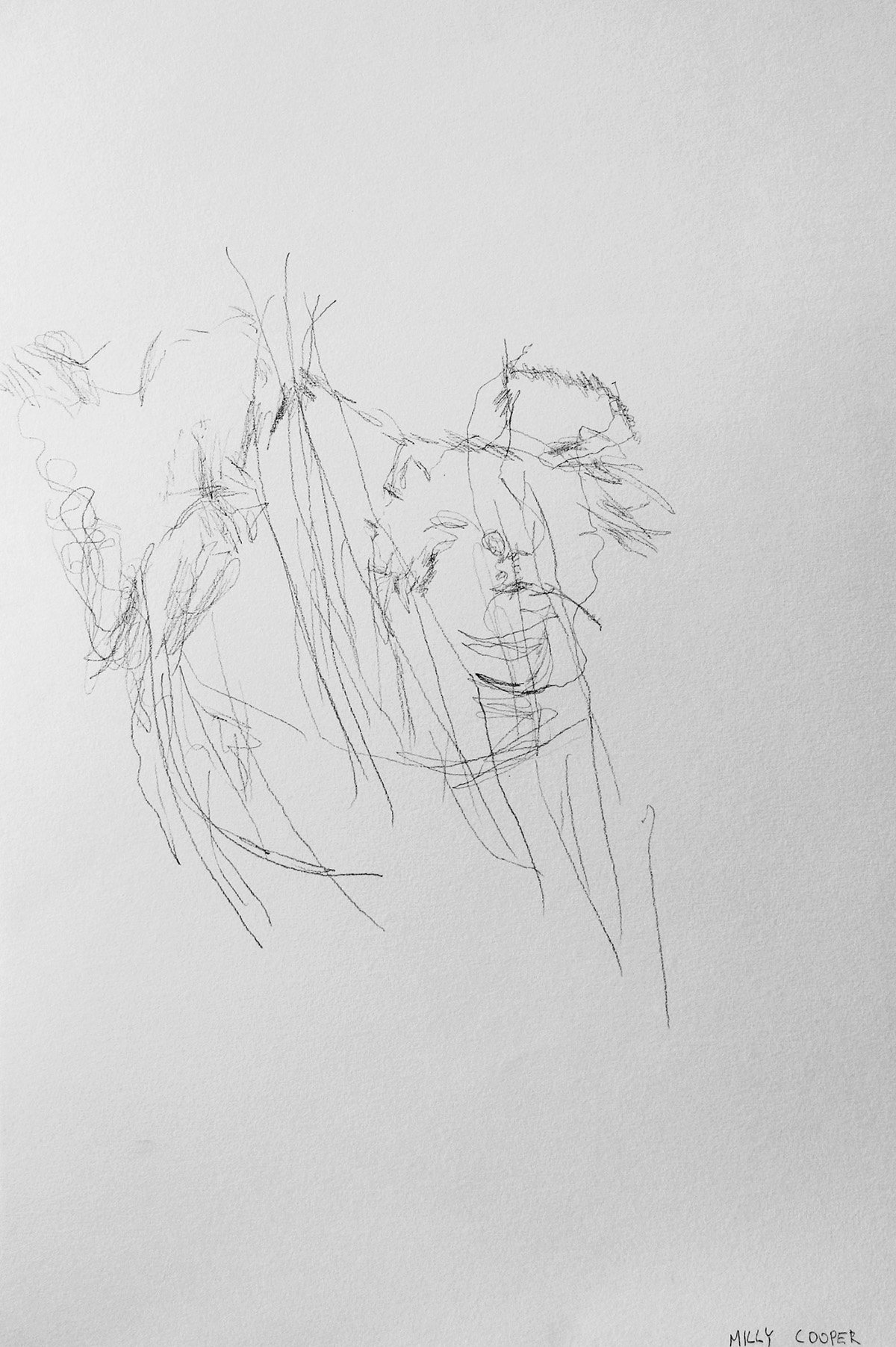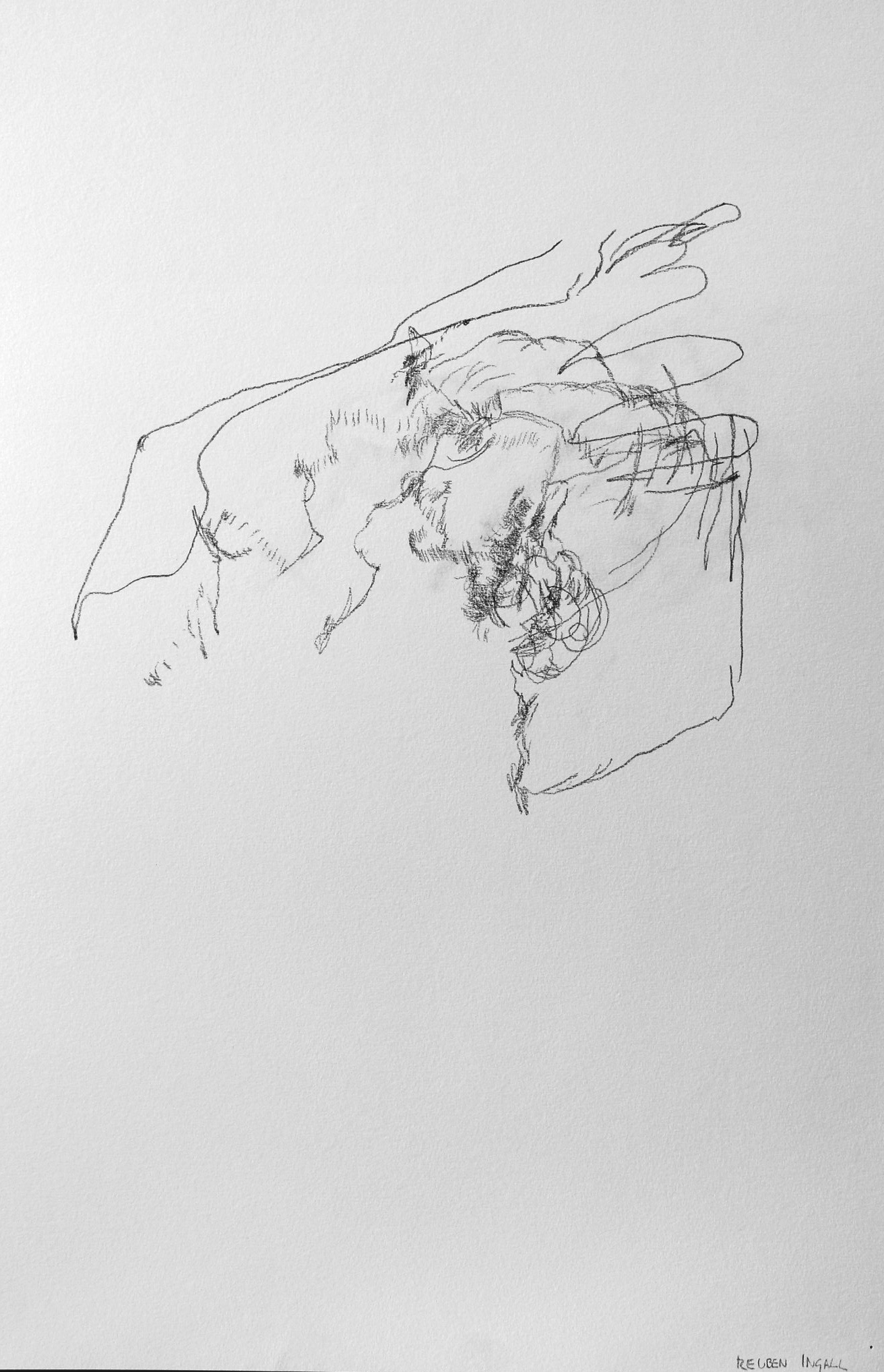 These are a series of proprioceptive life drawings, while wearing a blindfold I hold a pose and map out my body. I draw following a similar format to conventional life drawing sessions, the poses are between 3 and 5 minutes long.