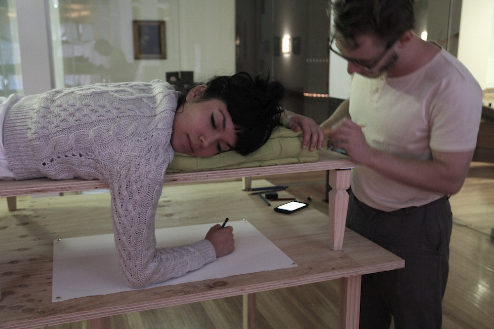 ^Finn O’Branagdin demonstrating how to use the chair, for the participatory drawings I trace on the persons face and ask them to make marks in direct response to the tactile and visual sensations.